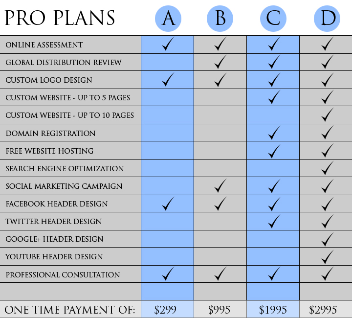 Payment is required at the beginning of the project. No exceptions. Once we receive your payment, work on your project can commence. If you choose Pro Plan C or D, please have a few website examples which you and your band or partners agree that you all like. This will give us a good idea of your personal design preferences and tastes.